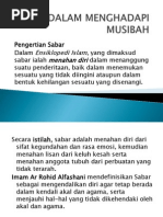 sabar tidak mengeluh dan tahan uji. Sabar adalah kekuatan jiwa dari segala bentuk kelemahan