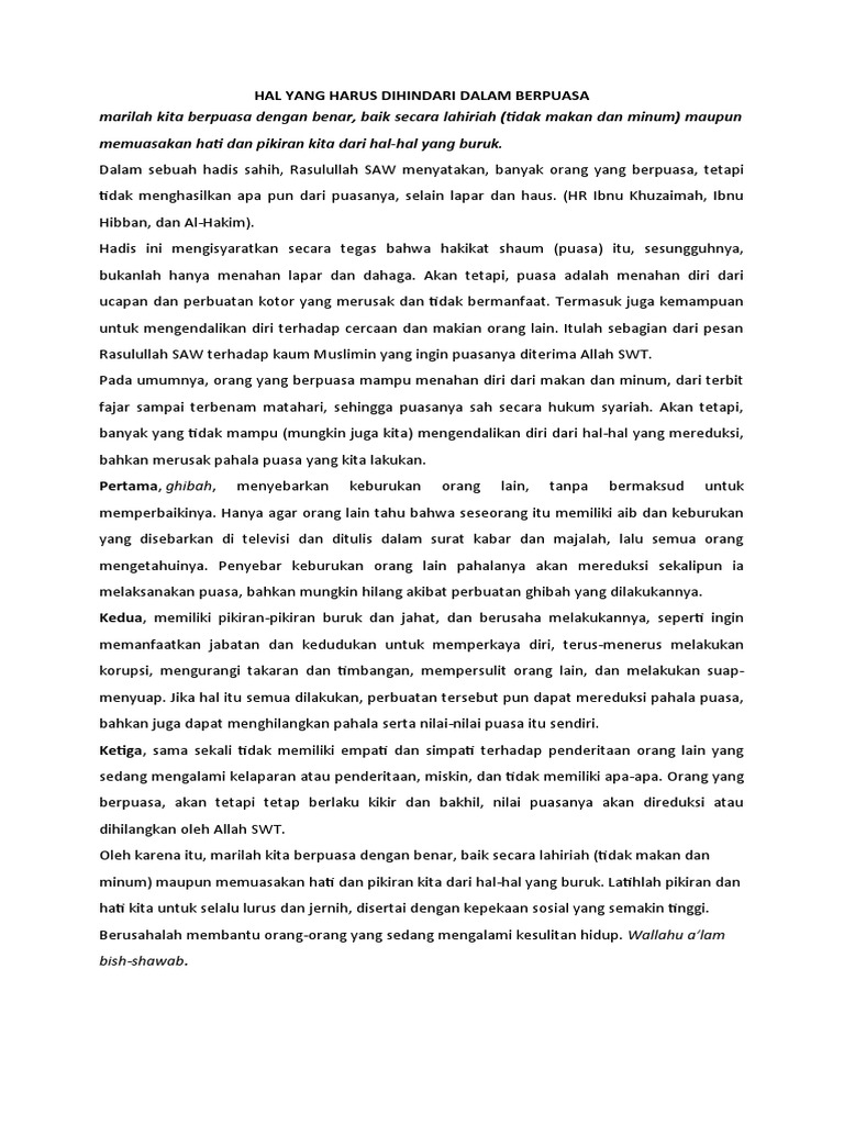 menyuap. Jika hal itu semua dilakukan, perbuatan tersebut pun dapat mereduksi pahala puasa,