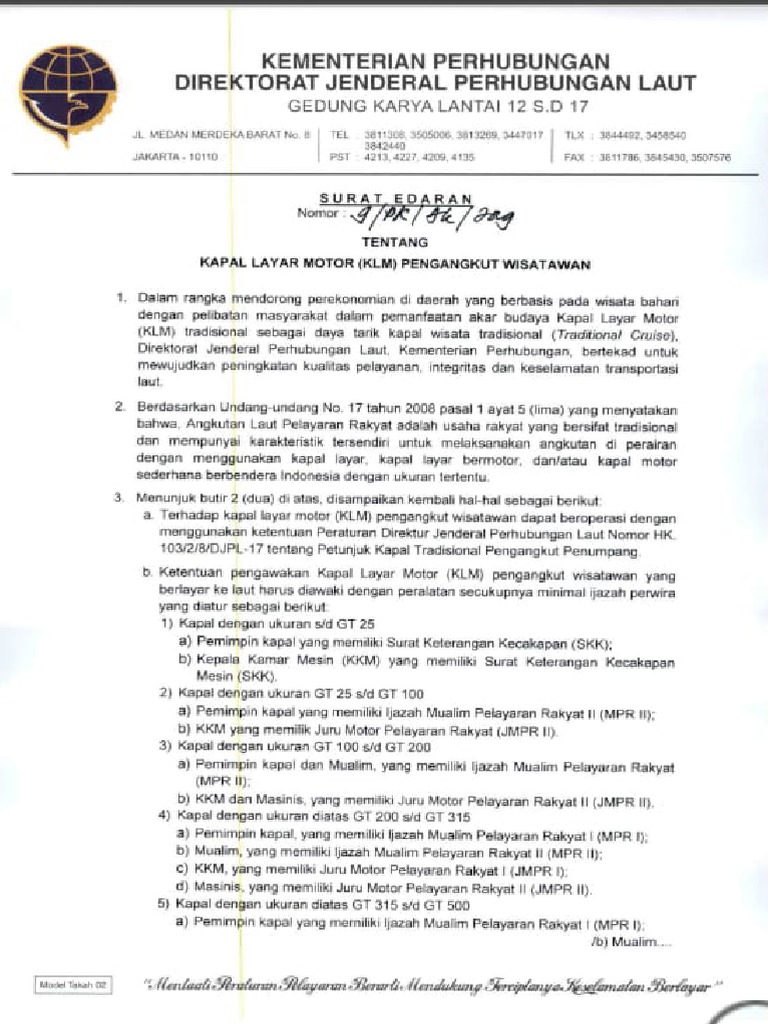 a. Terhadiap kapal layar moter (KLM) pengangkut wisatawan dapat beroperasi dengan