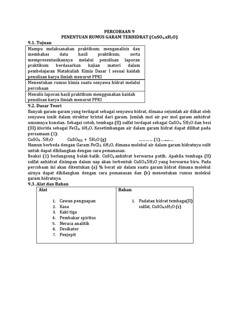 percobaan ini akan ditentukan (a) % berat air dalam suatu garam hidrat dimana molekul