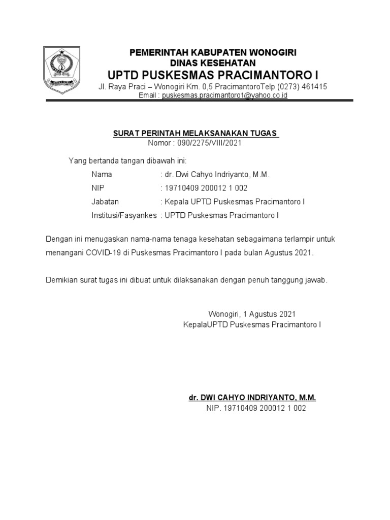 Jabatan : Kepala UPTD Puskesmas Pracimantoro I