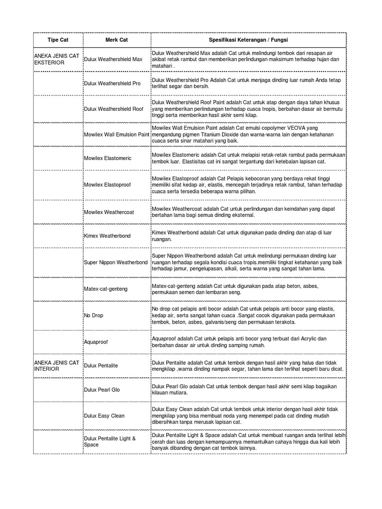 Tipe Cat Merk Cat Spesifikasi Keterangan / Fungsi