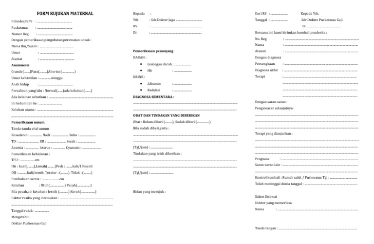 Polindes/BPS : ............................................... Yth : Sdr.Dokter Jaga .................................... Tanggal : ........................ Sdr.Dokter Puskesmas Gaji