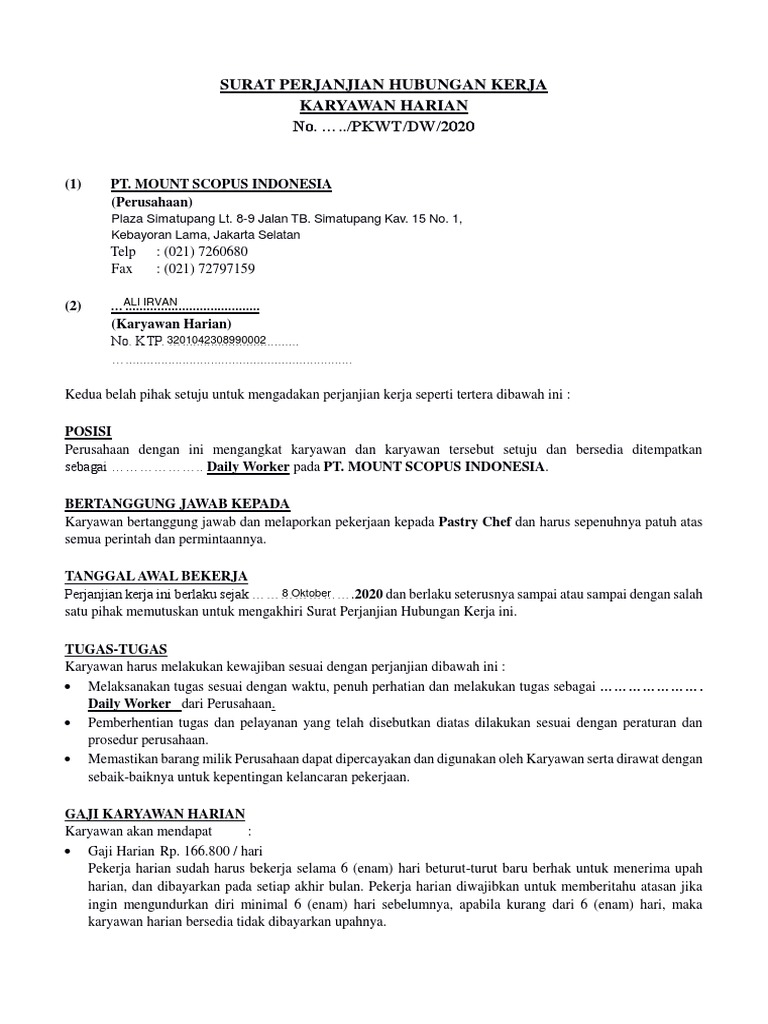 sebagai ……………….. Daily Worker pada PT. MOUNT SCOPUS INDONESIA.