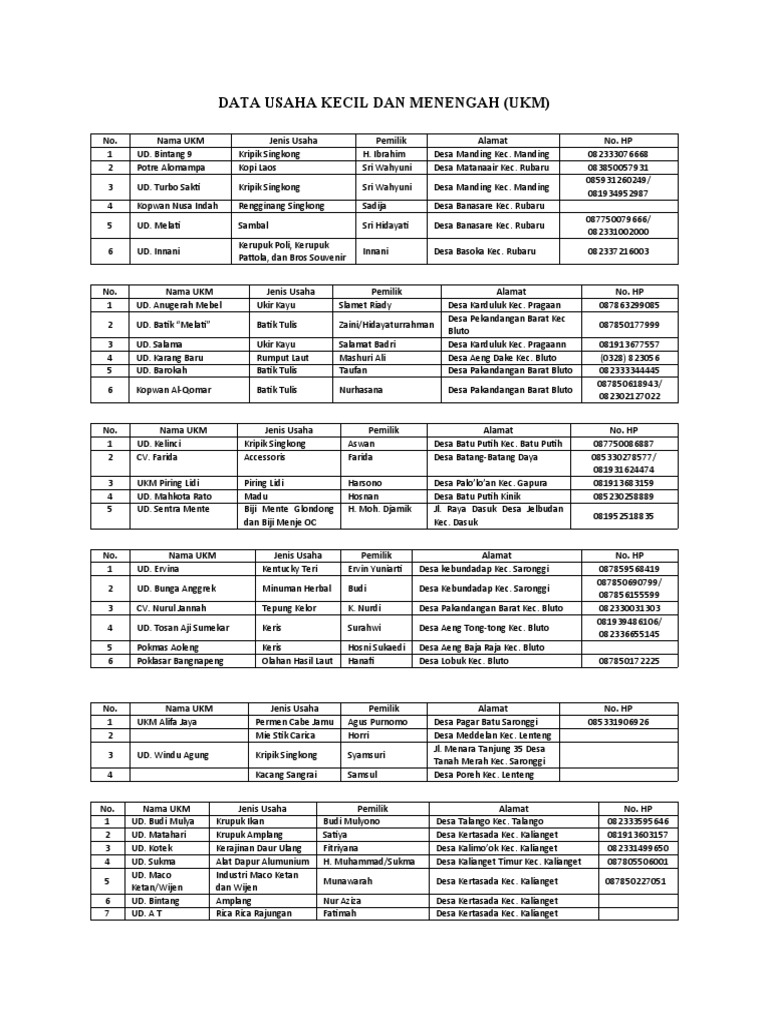 No. Nama UKM Jenis Usaha Pemilik Alamat No. HP