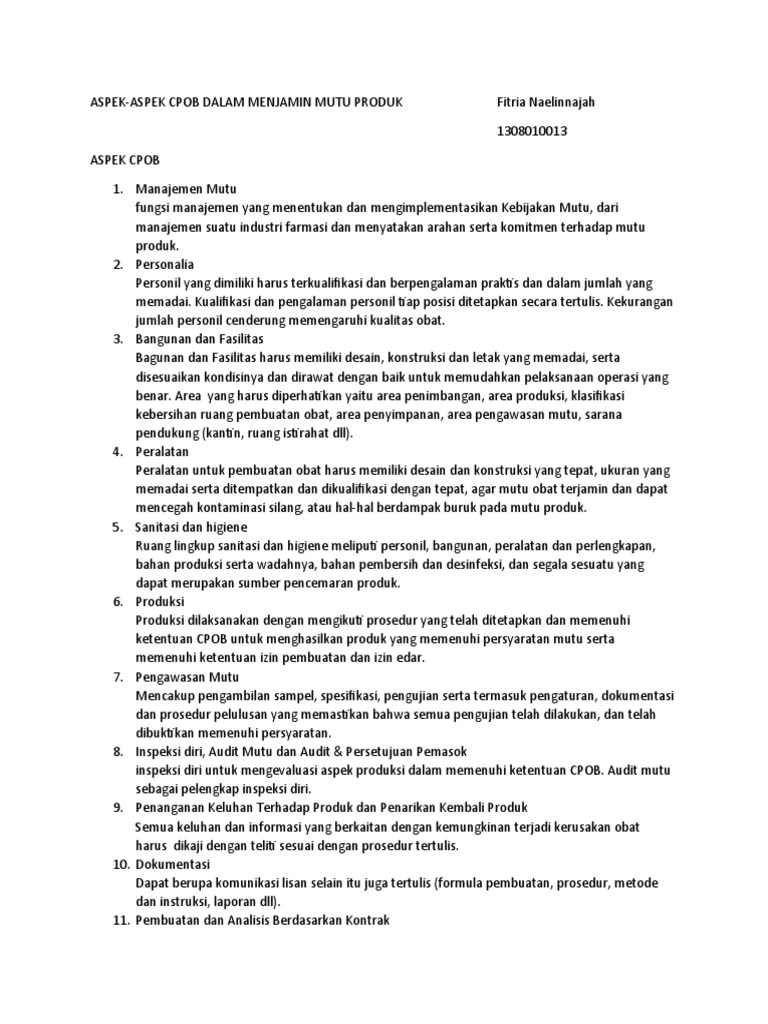 ASPEK-ASPEK CPOB DALAM MENJAMIN MUTU PRODUK Fitria Naelinnajah