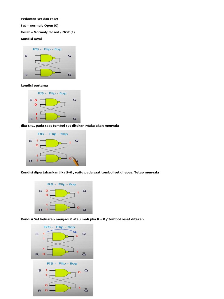 Kondisi Set keluaran menjadi 0 atau mati jika R = 0 / tombol reset ditekan