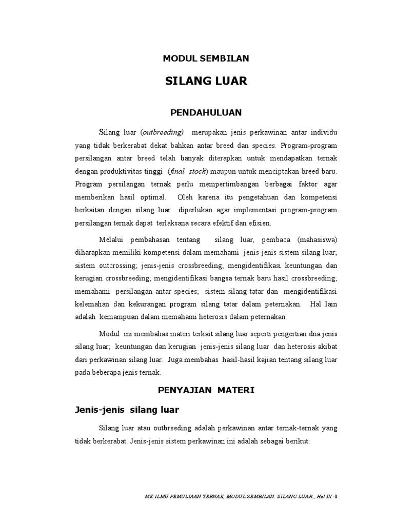 MK:ILMU PEMULIAAN TERNAK, MODUL SEMBILAN: SILANG LUAR:, Hal IX -1