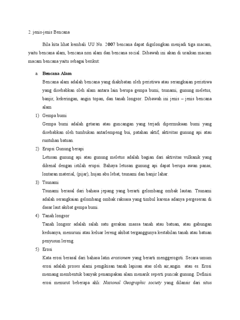 Bila kita lihat kembali UU No. 2𝟢𝟢7 bencana dapat digolongkan menjadi tiga macam,