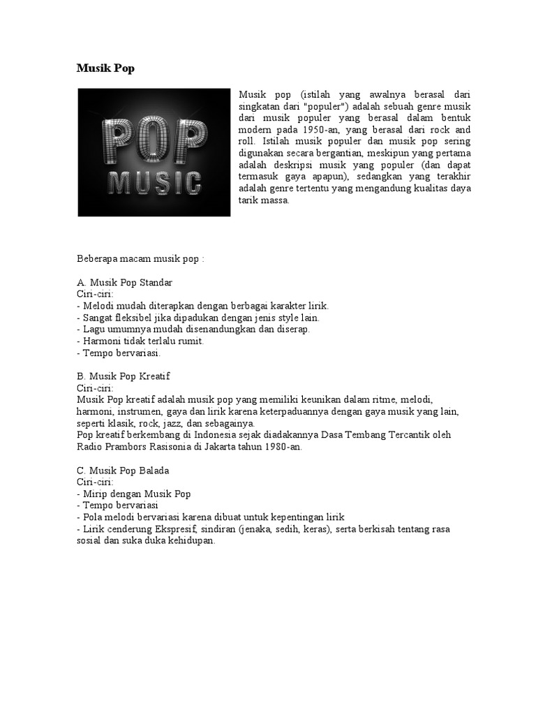 Musik pop berkembang di berbagai Negara dengan berbagai genre yakni: