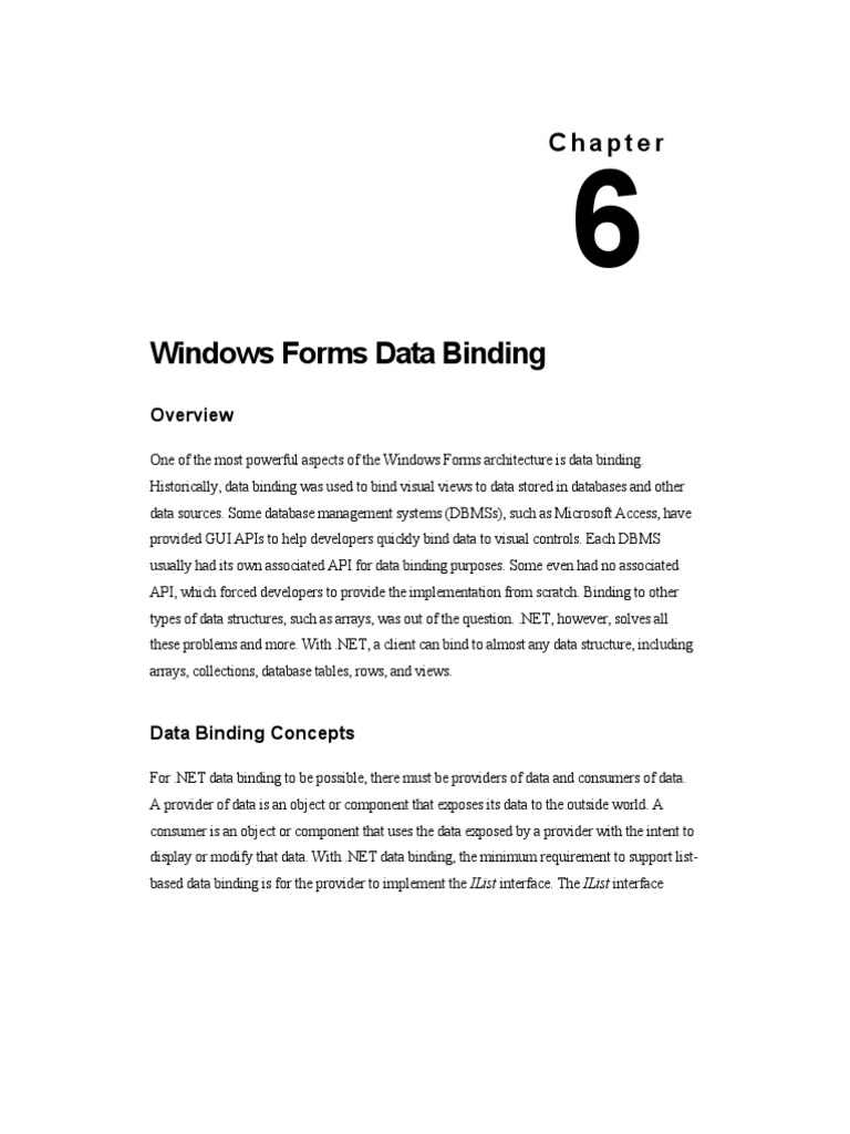 This chapter discussed the concepts and the architecture behind Windows Forms data binding.