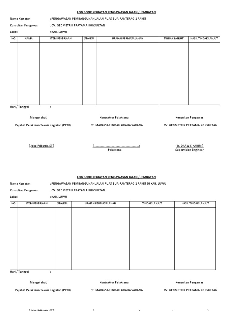 LOG BOOK KEGIATAN PENGAWASAN JALAN / JEMBATAN