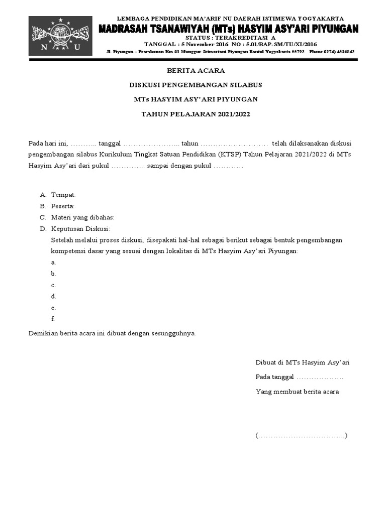 pengembangan silabus Kurikulum Tingkat Satuan Pendidikan (KTSP) Tahun Pelajaran 2021/2022 di MTs