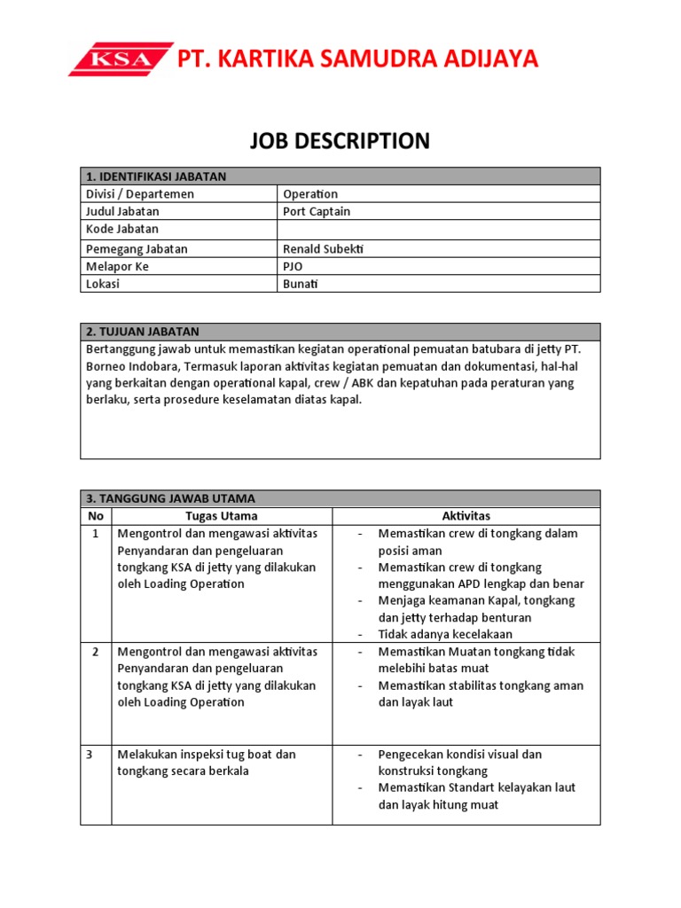 Bertanggung jawab untuk memastikan kegiatan operational pemuatan batubara di jetty PT.