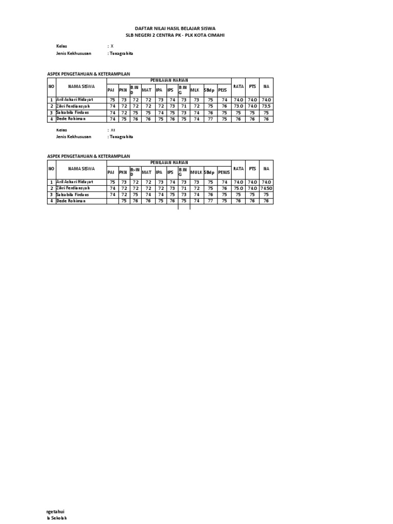 DAFTAR NILAI HASIL BELAJAR SISWA