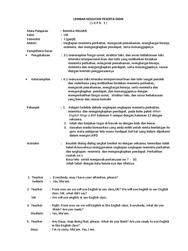 1. Teacher : Everybody, may I have your attention, please?