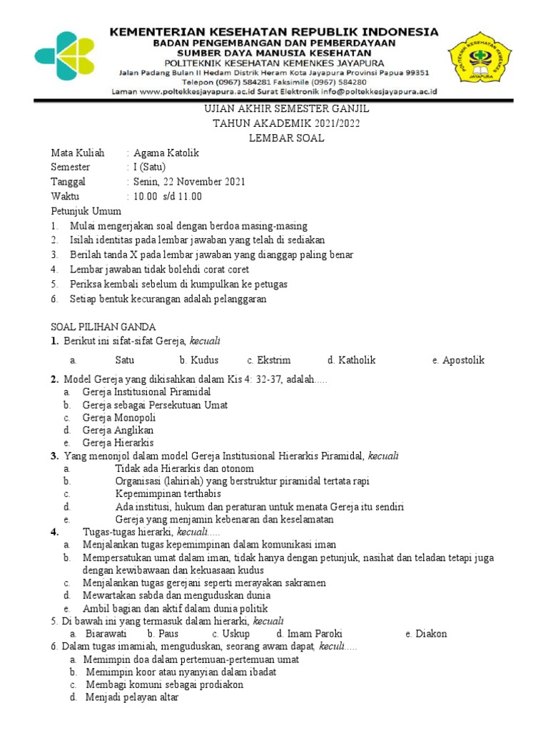 a. Biarawati b. Paus c. Uskup d. Imam Paroki e. Diakon