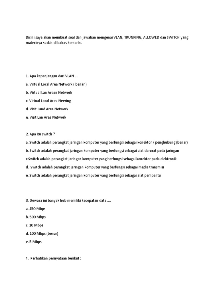 Disini saya akan membuat soal dan jawaban mengenai VLAN, TRUNKING, ALLOWED dan SWITCH yang
