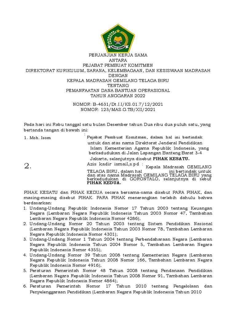 dan atas nama Madrasah GEMILANG TELAGA BIRU yang