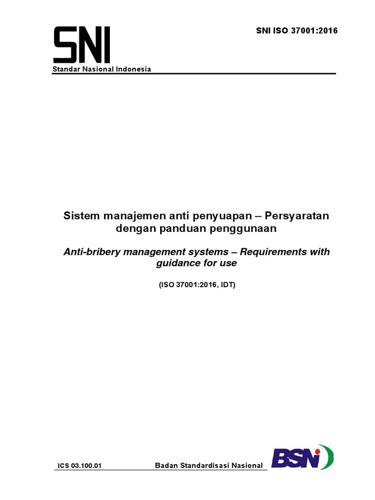 Standar Nasional Indonesia (SNI) ISO 37001:2016 dengan judul Sistem manajemen anti