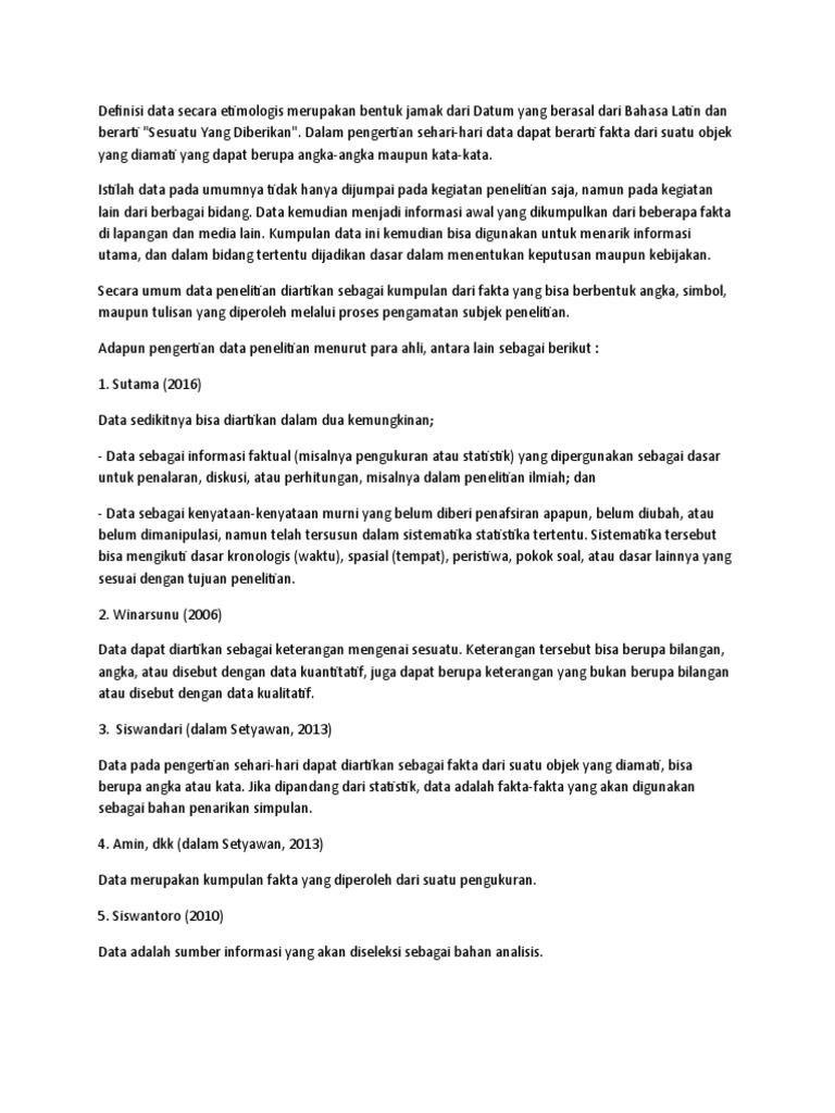 Definisi data secara etimologis merupakan bentuk jamak dari Datum yang berasal dari Bahasa Latin dan