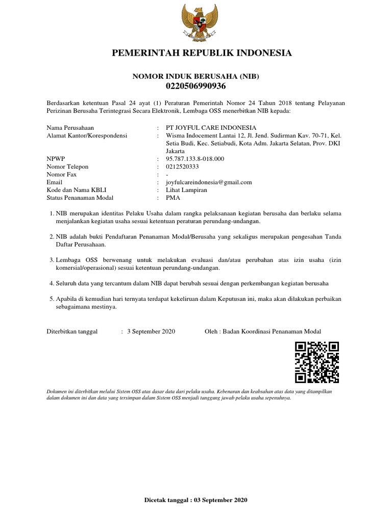 Dokumen ini diterbitkan melalui Sistem OSS atas dasar data dari pelaku usaha. Kebenaran dan keabsahan atas data yang ditampilkan
