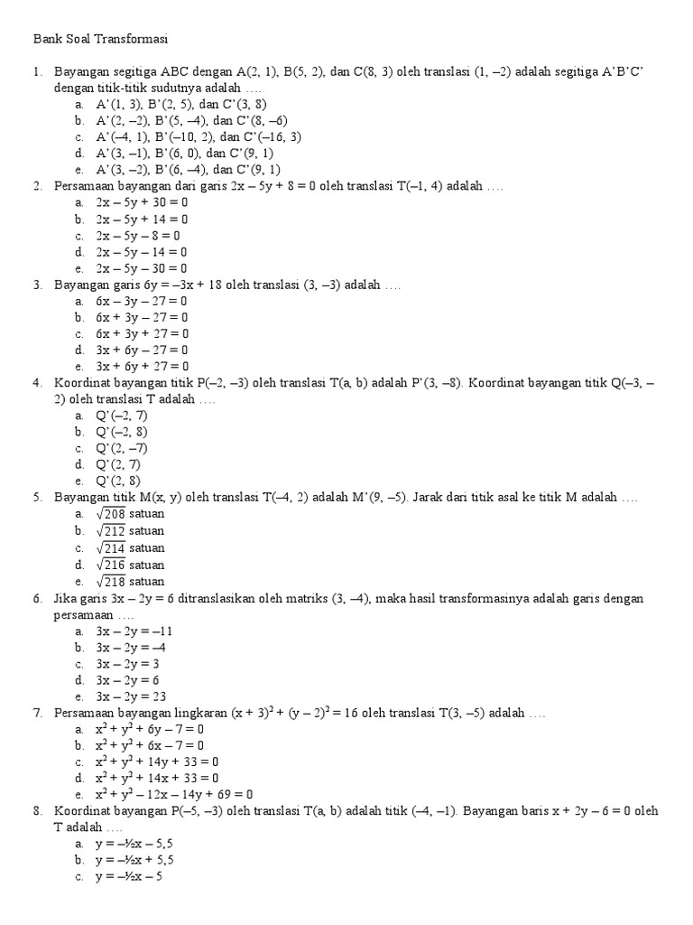 2. Persamaan bayangan dari garis 2x – 5y + 8 = 0 oleh translasi T(–1, 4) adalah ….