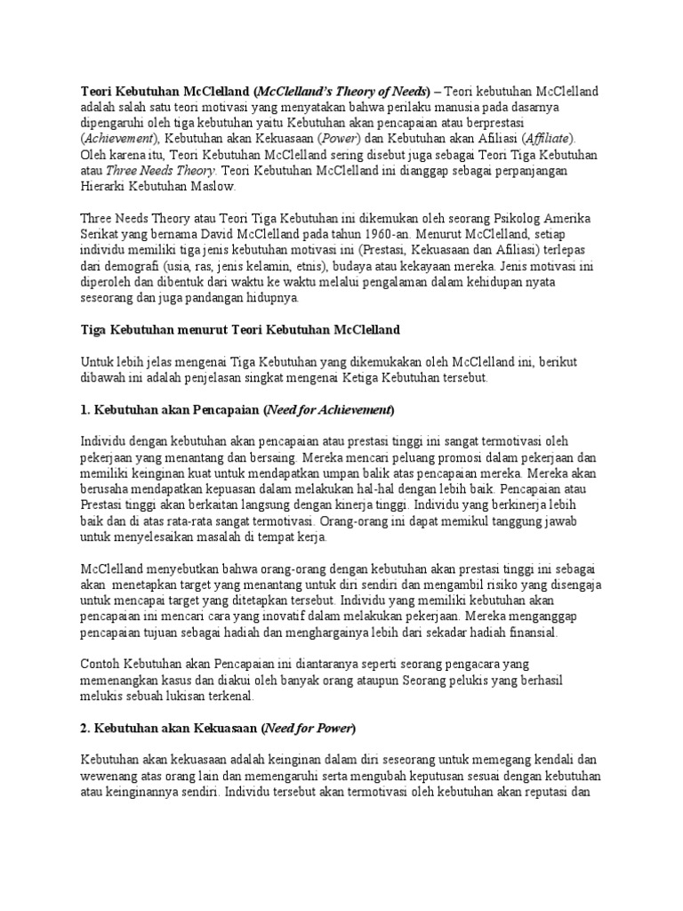 atau Three Needs Theory. Teori Kebutuhan McClelland ini dianggap sebagai perpanjangan