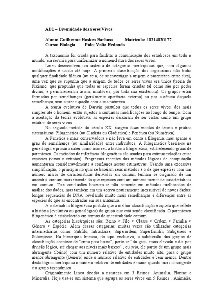 AD1 – Diversidade dos Seres Vivos