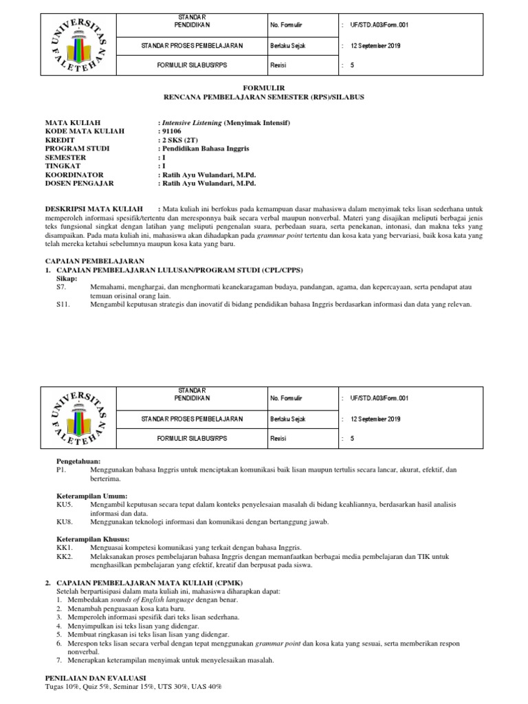 DESKRIPSI MATA KULIAH : Mata kuliah ini berfokus pada kemampuan dasar mahasiswa dalam menyimak teks lisan sederhana untuk