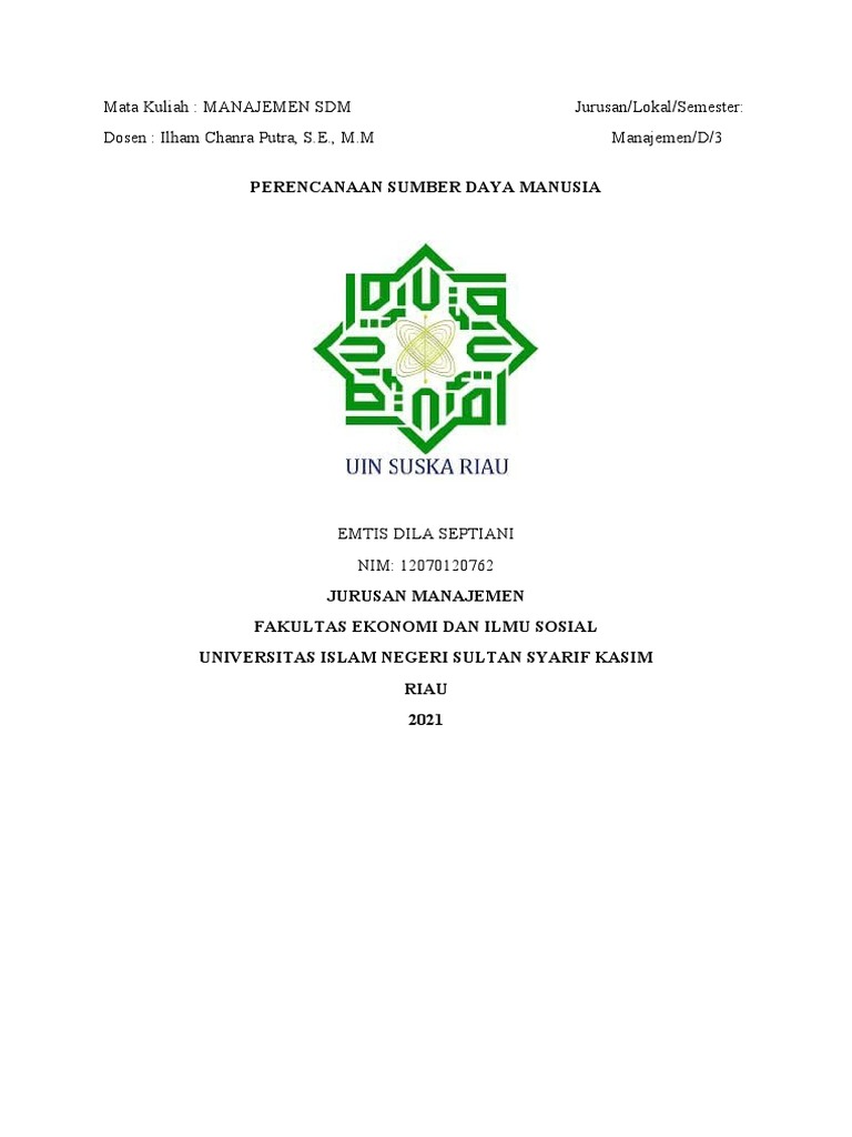 Mata Kuliah : MANAJEMEN SDM Jurusan/Lokal/Semester:
