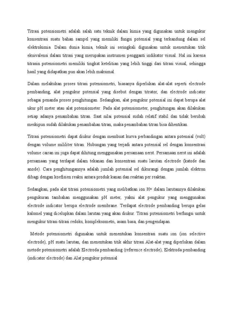 Titrasi potensiometri dapat diukur dengan membuat kurva perbandingan antara potensial (volt)