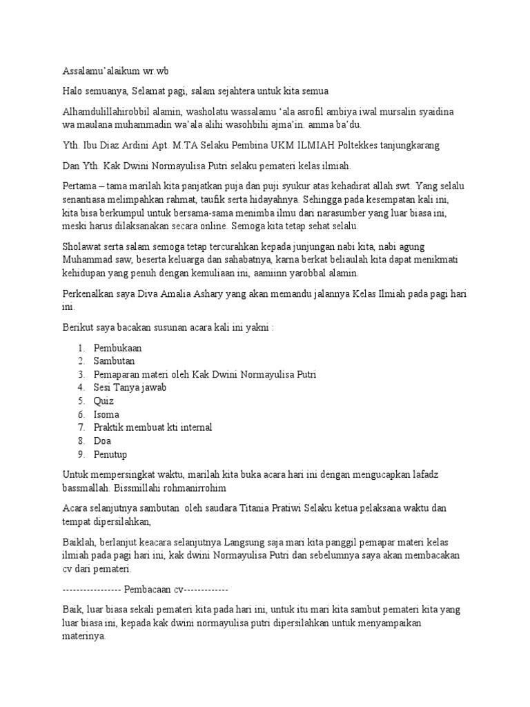 ilmiah pada pagi hari ini, kak dwini Normayulisa Putri dan sebelumnya saya akan membacakan