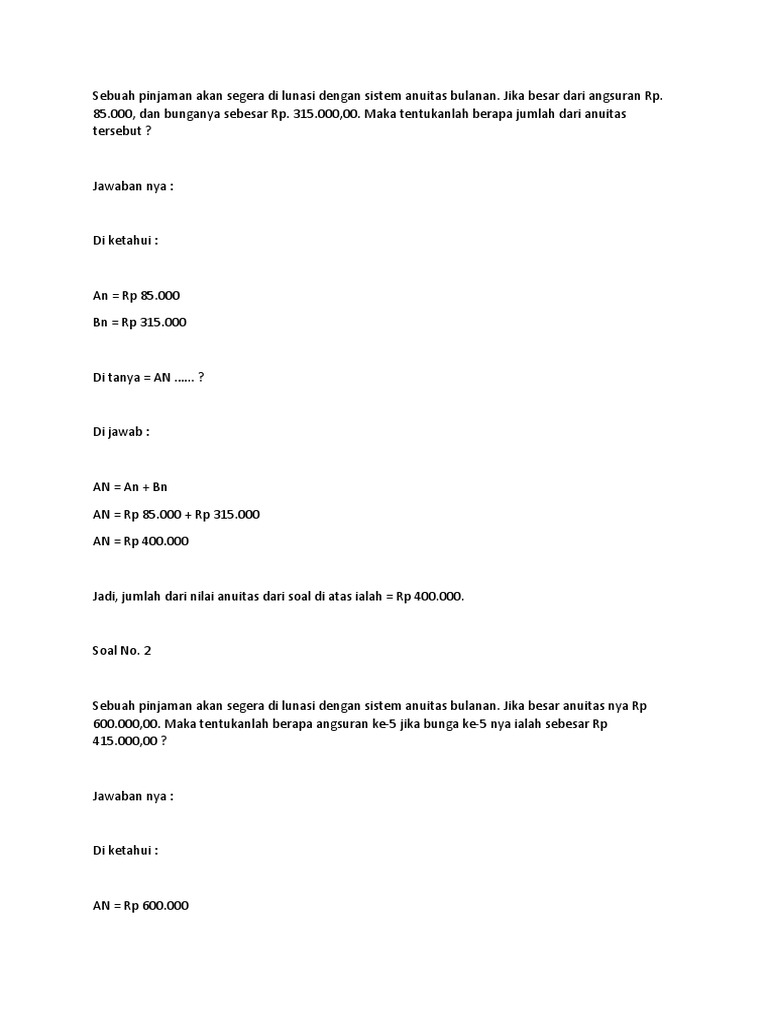 85.000, dan bunganya sebesar Rp. 315.000,00. Maka tentukanlah berapa jumlah dari anuitas