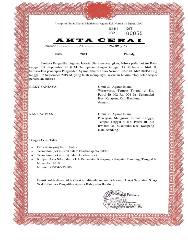 Demikianlah dibuat Akta Cerai ini, ditandatangani oleh kami H. Ayi Supriatna, S. Ag