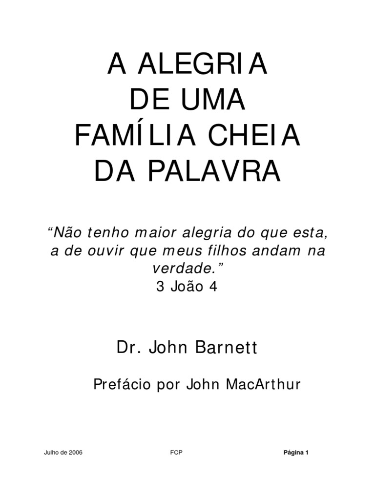 ainda outros parecem crer num cuidadoso treinamento em técnicas de criar filhos e que as mães e pais precisam de mais métodos de disciplina, sistemas para ensinar responsabilidade aos garotos e de programas detalhados de educação dos filhos para ajudar aos pais que não têm a mínima idéia de como resolver os problemas. Todas estas coisas são boas e úteis na medida apropriada. Mas em seu perceptivo livro, o Dr. John Barnnet relembra-nos que a melhor e mais importante maneira que os cristãos devem buscar para reagir às tendências de uma sociedade hostil à família é fazendo da Palavra de Deus o centro e o foco de sua própria vida familiar. O mais profundo e duradouro impacto que nós podemos fazer na sociedade começa com o fortalecimento de nossas próprias famílias e a única maneira duradoura e efetiva de fazermos isso é dar à Palavra de Deus seu lugar de direito no centro da família.