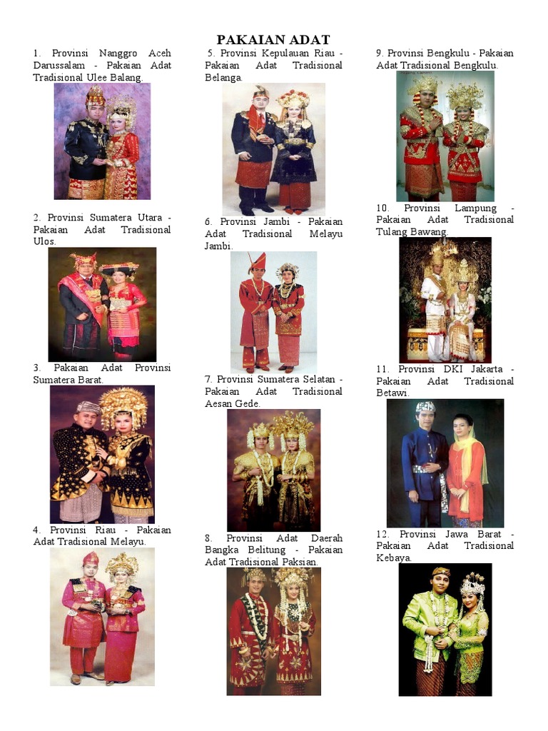 1. Provinsi Nanggro Aceh 5. Provinsi Kepulauan Riau - 9. Provinsi Bengkulu - Pakaian