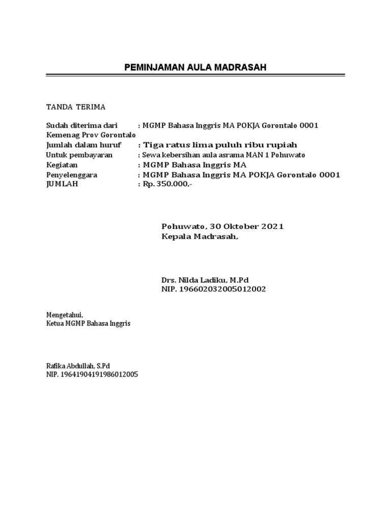 Jumlah dalam huruf : Tiga ratus lima puluh ribu rupiah