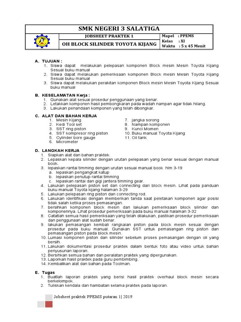 1. Siswa dapat melakukan pelepasan komponen Block mesin Mesin Toyota Kijang