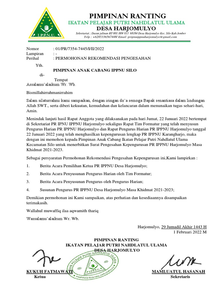 Jember untuk menerbitkan Surat Pengesahan Kepengurusan PR IPPNU Harjomulyo Masa Khidmat
