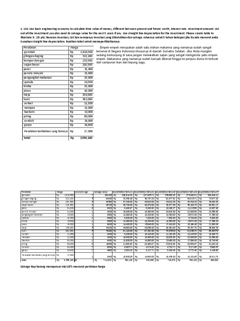 illustrate it. (25 pts) Besaran investasi; List kan semuanya investasi yang dibutuhkan dan salvage valuenya untuk 5 tahun kedepan jika itu ada menurut anda.