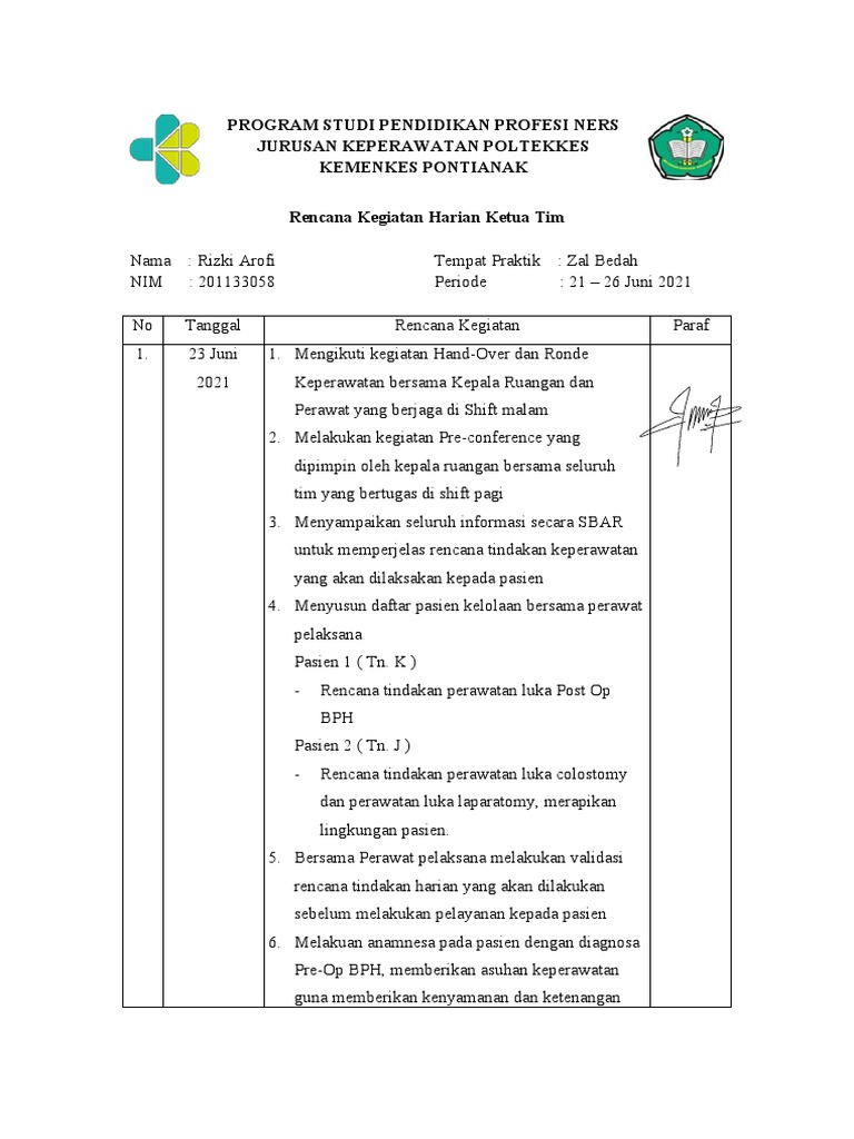 Rencana Kegiatan Harian Ketua Tim