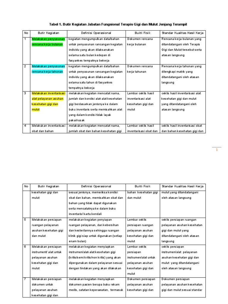 kegiatan pada setiap jenjang jabatan fungsional terapis gigi dan