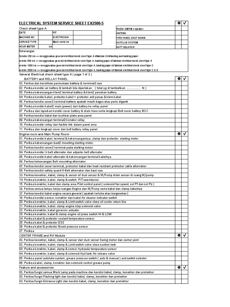service 500 hrs >> menggunakan general electrical check sheet type A, backlog paper di tambah electrical check sheet type B