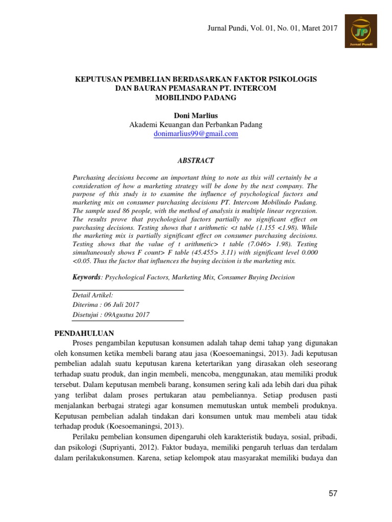 Keywords: Psychological Factors, Marketing Mix, Consumer Buying Decision
