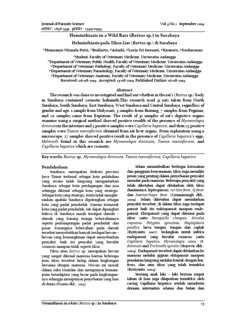 Heminthiasis in a Rats (Rattus sp.) in Surabaya 73