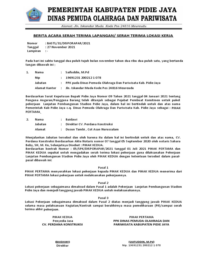Demikian Berita Acara Serah Terima Akhir Pekerjaan ini dibuat dan ditandatangani di Meureudu pada