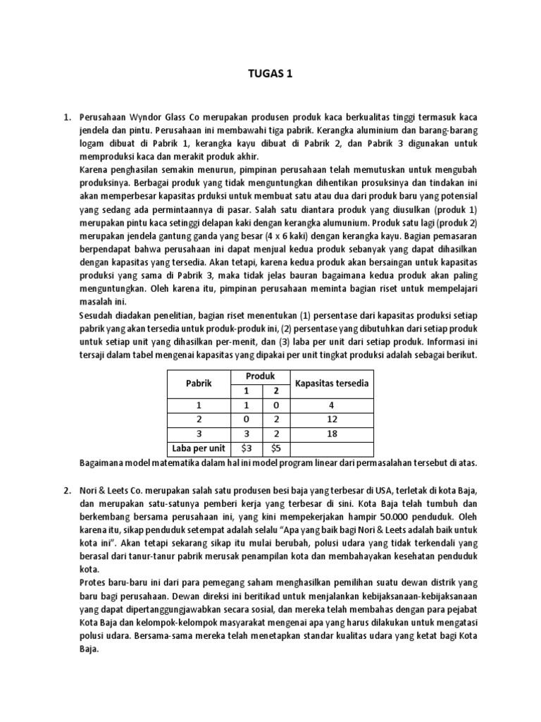 1. Perusahaan Wyndor Glass Co merupakan produsen produk kaca berkualitas tinggi termasuk kaca
