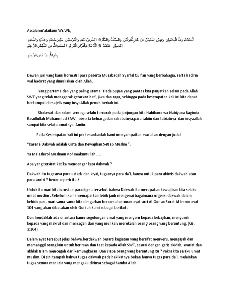Dewan juri yang kami hormati! para peserta Musabaqah Syarhil Qur’an yang berbahagia, serta hadirin