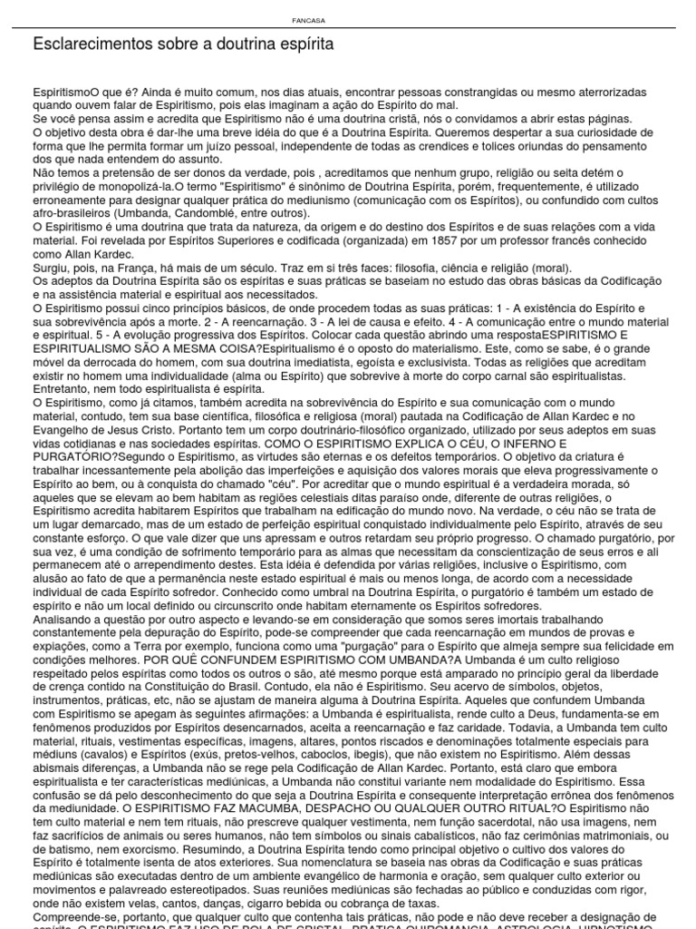 de batismo, nem exorcismo. Resumindo, a Doutrina Espírita tendo como principal objetivo o cultivo dos valores do